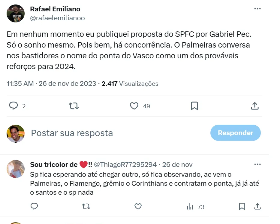 “Só há hoje o sonho (do São Paulo) mesmo. Pois bem, há concorrência. O Palmeiras conversa nos bastidores o nome do ponta do Vasco como um dos prováveis reforços para 2024”, complementou Emiliano.