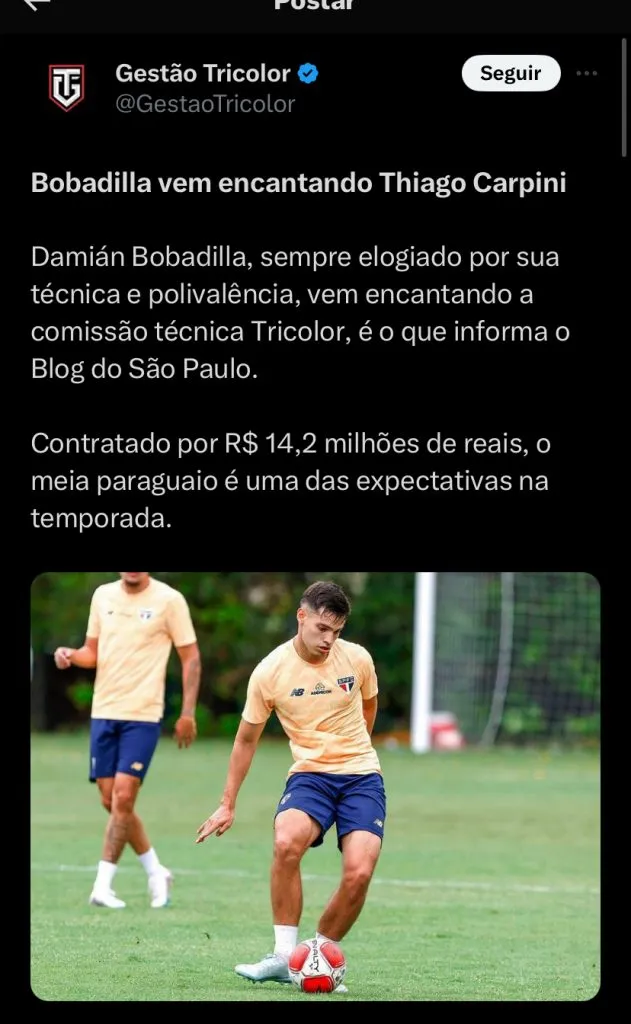 Reforço para a temporada 2024 do São Paulo Futebol Clube, Damián Bobadilla será apresentado nesta sexta-feira (26), para uma coletiva de imprensa ao lado de Ferreirinha, outro reforço para o time de Carpini.