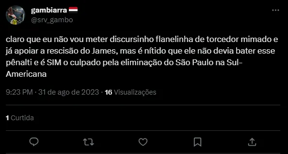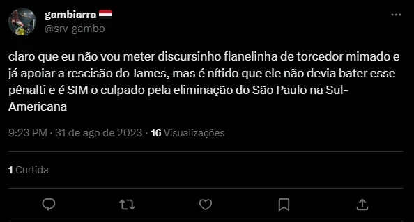 “Claro que eu não vou meter discursinho flanelinha de torcedor mimado e já apoiar a rescisão do James, mas é nítido que ele não devia bater esse pênalti e é SIM o culpado pela eliminação do São Paulo na Sul-Americana”;