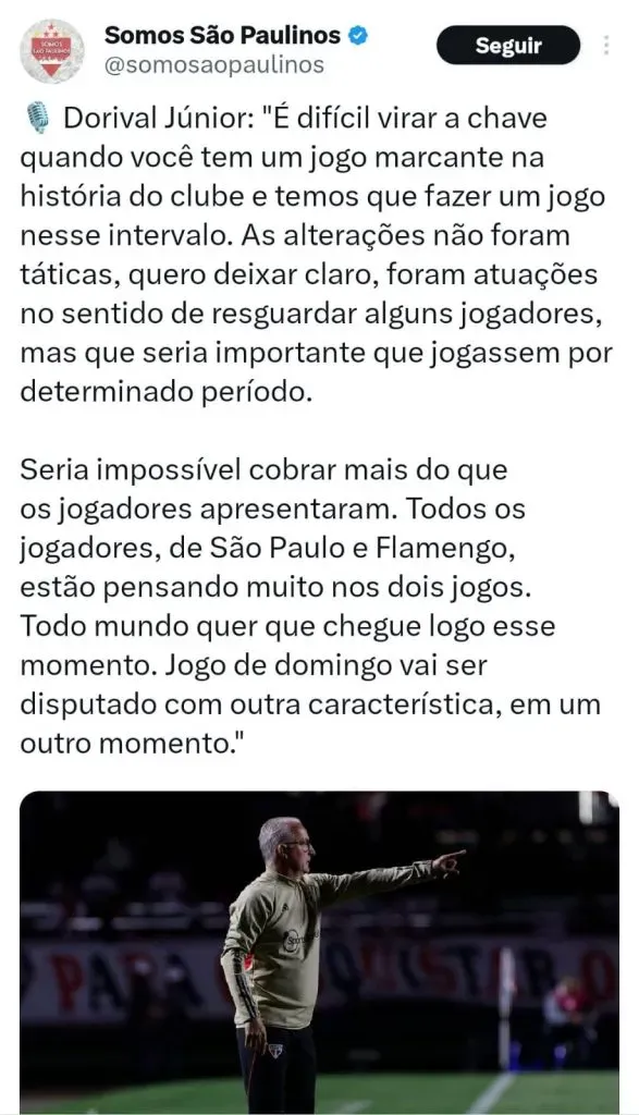 “O São Paulo foi ridículo ontem, foi uma péssima noite do Dorival, uma invenção na escalação. O Dorival teve atendido tudo que pediu à diretoria, não vendeu ninguém, e ainda trouxe o James e o Lucas. Ele está tentando acomodar todo mundo, menos o Lucas e o James, que ainda está fora de forma, e deu errado, deu muito errado. Ele conseguiu matar o jogo do Lucas, que é melhor pelo centro e ele colocou pelo lado, e matou o jogo do Luciano”, criticou durante participação no podcast Uol News Esporte.