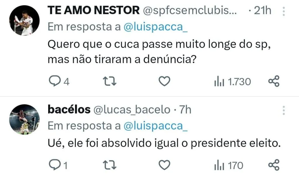 “Tô nem sugerindo, tô colocando uma situação. É um nome que só não entra lá na pauta, teoricamente, porque o São Paulo não brigaria com rede social. E vai dar uma repercussão tremenda como já aconteceu”, projetou Flávio Prado.