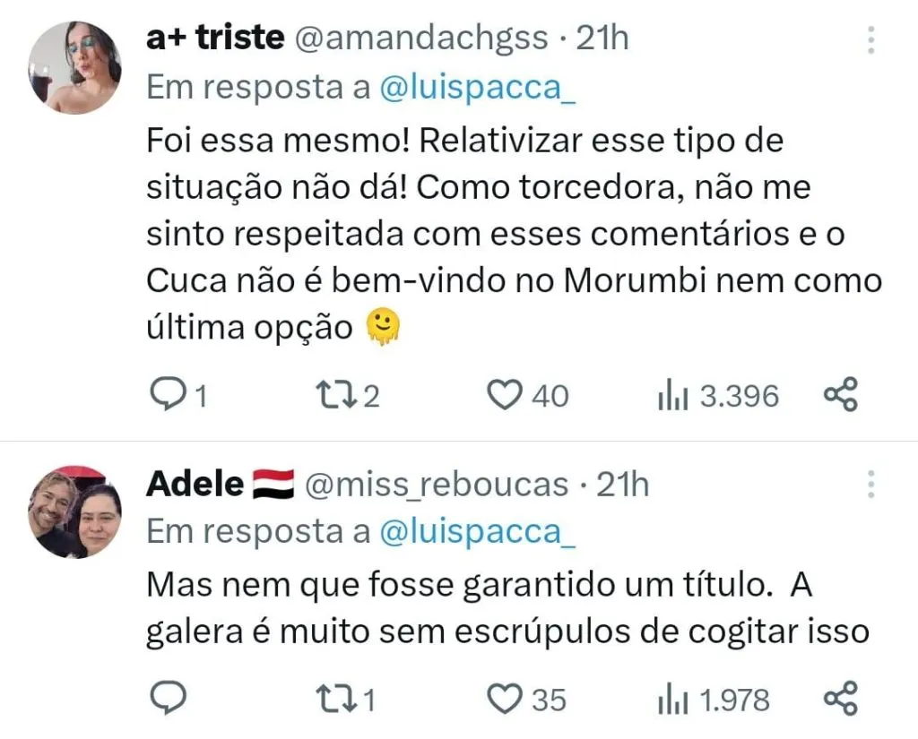 Apesar disso, Flavio Prado acredita que o não deve comprar uma briga com o torcedor nas redes sociais. Vale lembrar que no ano passado, Cuca foi pressionado a pedir demissão do Corinthians após apenas dois jogos, uma acusação de violência sexual, da qual recentemente teve a condenação anulada.