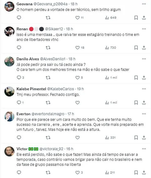 “Vocês não duvidem que o James Rodríguez vai começar o jogo contra a Inter de Limeira em Brasília, e para colocar o James, tem que mudar o time todo. Nessa da tentativa e erro, a gente vai compreendendo melhor as características do treinador, que terá problemas e desafios como lidar com as estrelas, vai sobrar alguém do meio para frente”, detalhou.