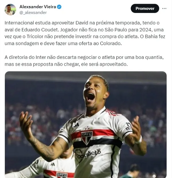 Internacional estuda aproveitar David na próxima temporada, tendo o aval de Eduardo Coudet. Jogador não fica no São Paulo para 2024, uma vez que o Tricolor não pretende investir na compra do atleta. O Bahia fez uma sondagem e deve fazer uma oferta ao Colorado.