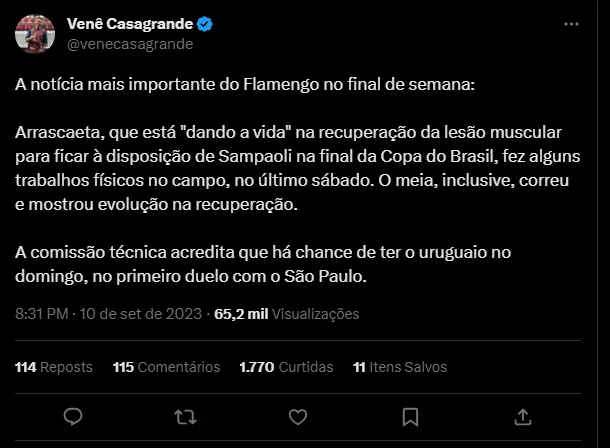 “A notícia mais importante do Flamengo no final de semana: Arrascaeta, que está “dando a vida” na recuperação da lesão muscular para ficar à disposição de Sampaoli na final da Copa do Brasil, fez alguns trabalhos físicos no campo, no último sábado. O meia, inclusive, correu e mostrou evolução na recuperação. A comissão técnica acredita que há chance de ter o uruguaio no domingo, no primeiro duelo com o São Paulo“, noticiou Venê.
