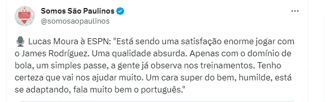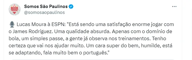 Ainda assim, Lucas Moura, outro reforço e que vem sendo um dos principais jogadores do Soberano, se rendeu ao futebol do colombiano: “Está sendo uma satisfação enorme jogar com o James Rodríguez. Uma qualidade absurda. Apenas com o domínio de bola, um simples passe, a gente já observa nos treinamentos. Tenho certeza que vai nos ajudar muito. Um cara super do bem, humilde, está se adaptando, fala muito bem o português”, disse à ESPN.