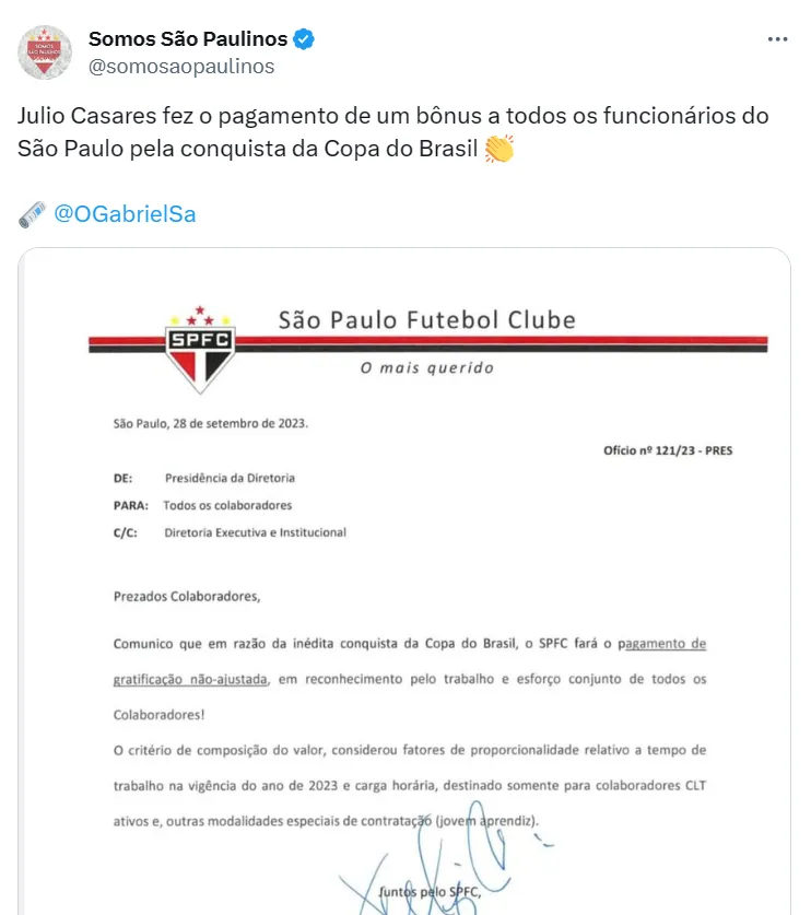Em memorando assinado pelo presidente Julio Casares, o São Paulo garantiu o pagamento da “gratificação não-ajustada” pelo título do torneio nacional. O critério de pagamento considerou tempo de trabalho no ano de 2023 e carga horária. O “cascalho” foi pago somente para funcionários de regime CLT (Consolidação das Leis do Trabalho) e outras modalidades de contratações, como os casos dos jovens aprendizes.