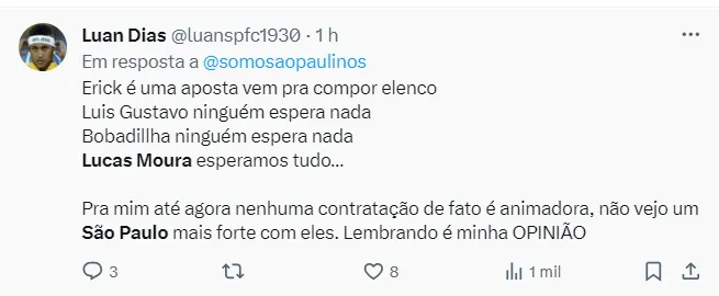 Lucas ainda afirmou que a torcida do São Paulo pesou para sua permanência: ”Claro que a gente tem que tomar a decisão de cabeça fria, mas meu coração é são-paulino. Tinha muita vontade de continuar aqui, de vestir essa camisa novamente, ver o torcedor pulando na arquibancada. Isso mexia muito comigo. Tudo que eu já vivi aqui no São Paulo e essa ansiedade de viver isso de novo foi muito importante na minha decisão”, explicou.