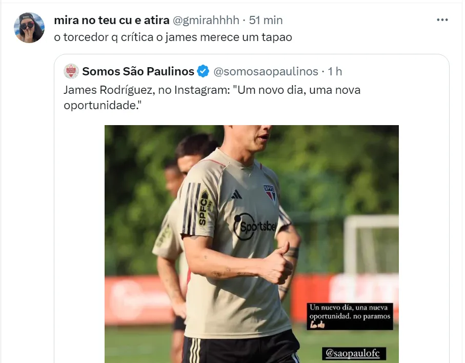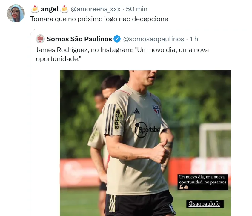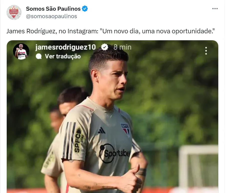 James vem recebendo o apoio do elenco para dar a volta por cima no São Paulo e ajudar a equipe na final da Copa do Brasil contra o Flamengo. Na última sexta-feira (1), ele fez uma postagem um story no Instagram com a legenda: “Um novo dia, uma nova oportunidade”. A frase vem repercutindo com a torcida Tricolor na web.