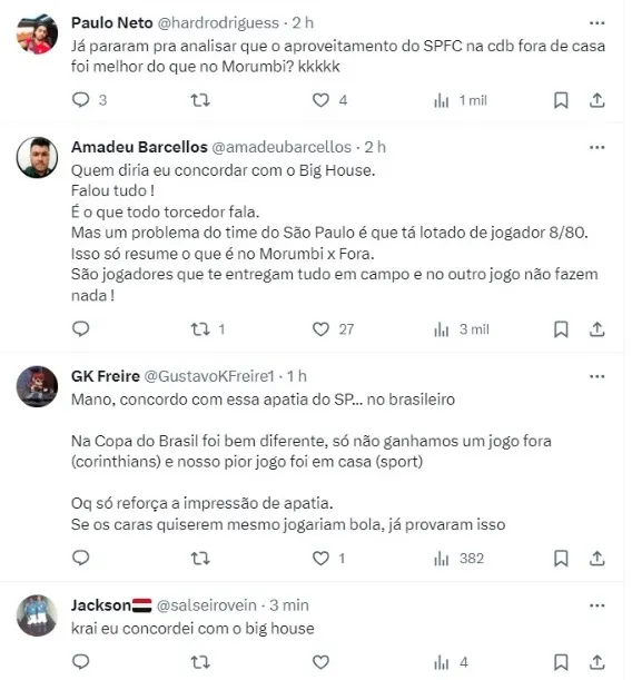 “É amassado pelo Goiás, pelo Palmeiras, é amassado por todo mundo quando está longe do Morumbi“, finalizou Casagrande, recebendo comentários de são-paulinos, inclusive, concordando com a declaração.