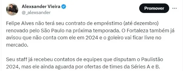 Felipe Alves não terá seu contrato de empréstimo (até dezembro) renovado pelo São Paulo na próxima temporada. O Fortaleza também já avisou que não conta com ele em 2024 e o goleiro vai ficar livre no mercado. Seu staff já recebeu contatos de equipes que disputam o Paulistão 2024, mas ele ainda aguarda por ofertas de times da Séries A e B.