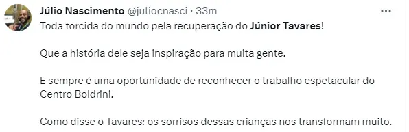 O jogador também falou ao Globo Esporte pela primeira vez sobre o tumor no cérebro que foi descoberto em julho, quando começou a sentir dores de cabeça frequentes durante treinos e jogos. Ele passou pela cirurgia em 21 de setembro e, felizmente, recebeu a notícia de que tudo correu bem e que sua recuperação está indo bem. Júnior Tavares continua otimista e espera retornar aos gramados em breve.