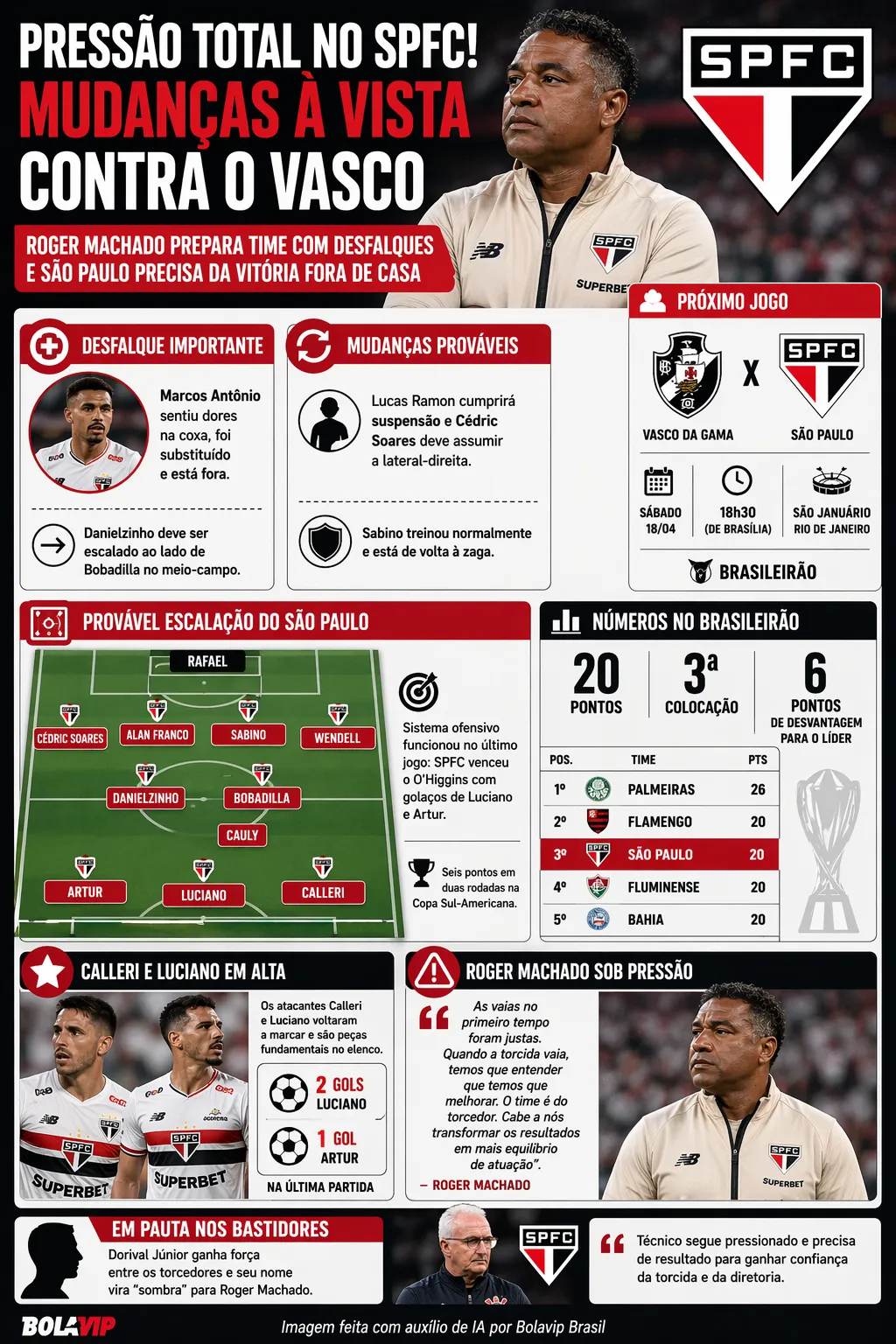Pressionado na temporada, o São Paulo entra em campo neste sábado (18), contra o Vasco da Gama, fora de casa, às 18h30 (de Brasília). Roger Machado tem alguns desfalques e prepara mudanças no time titular.