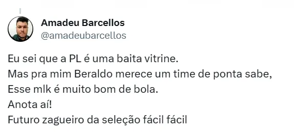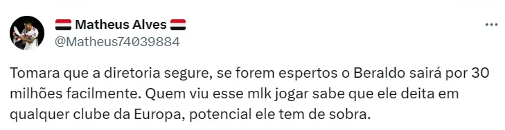 Uma proposta está sendo preparada para tirar Beraldo do Morumbi: 20 milhões de euros (cerca de R$ 107 milhões na cotação atual). O Tricolor já teria avisado que por menos desse valor sequer abriria conversas.