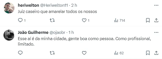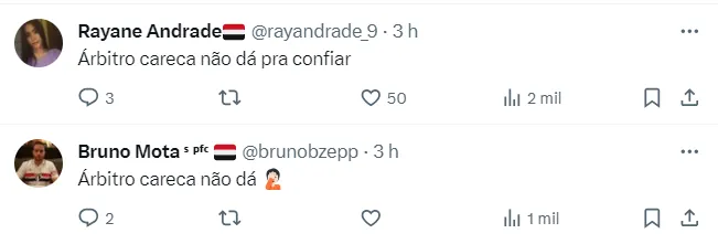 Alguns brincaram com a escolha de Vinícius, dizendo que em “árbitro careca não dá para confiar”. Outros foram além, e disseram que se o juiz ainda não prejudicou o São Paulo em clássicos, “amanhã será o dia”. Confira mais mensagens abaixo.