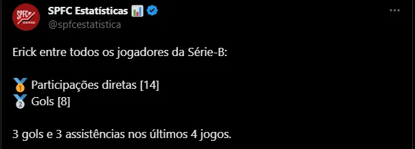 Posto isso, vale ressaltar que o jogador trabalhou com Dorival Júnior no Alvinegro de Porangabuçu e foi um pedido do treinador. Contudo, o jovem ponta “explodiu” mesmo em 2023. Por mais que o Vovô venha oscilando na Série B, Erick é o jogador que mais participou diretamente de gols na competição. Ao todo, foram 14 participações, com dez tentos e outras quatro assistências. É o vice-artilheiro da segundona, ao lado de Vagner Love.