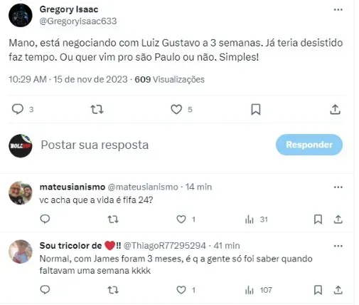 Vale lembrar que esse processo de ‘convencer’ Luiz Gustavo conta com a ajuda de Rafinha, titular na lateral-direita, já que ambos jogaram juntos pelo Bayern de Munique, entre 2011 e 2014.
