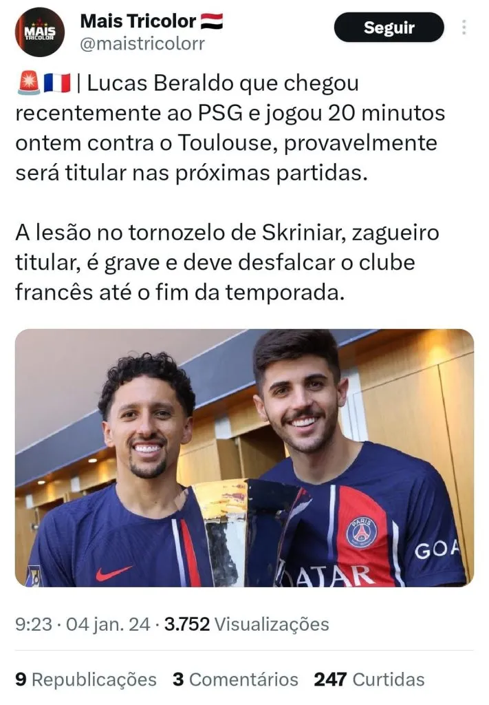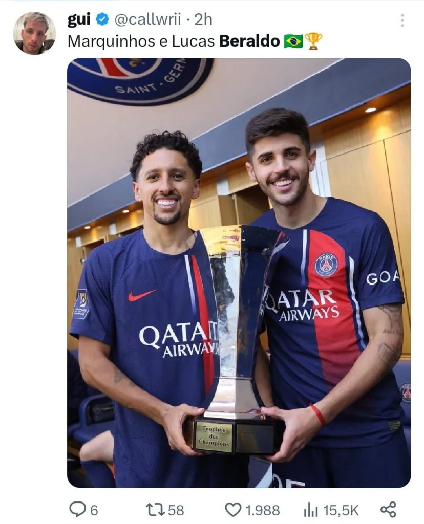 Mas Beraldo vai no sentido oposto, e parece ter caído nas graças do torcedor parisiense que vibrou a cada toque de Beraldo na bola. Na última quarta-feira (3), o zagueiro estreou na final da Supercopa da França e participou da vitória da equipe contra o Toulouse.