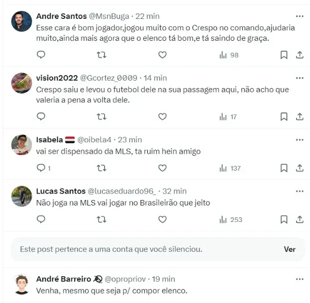Um torcedor comentou que aceitaria o retorno do meio-campista e que ele sabe jogar muito no futebol Brasileiro. Outro torcedor, porém, não gostou tanto assim de cogitarem o retorno do atleta.