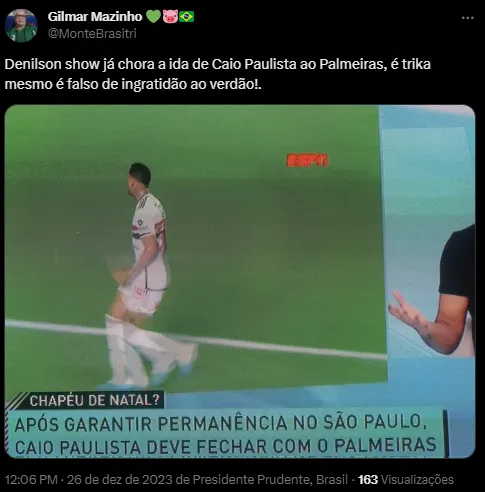 “O jogador precisa ter uma postura, precisa tomar uma decisão. No fundo, quem sofre é o jogador, quem está sendo criticado, bombardeado nas redes sociais é o Caio Paulista. O empresário tinha que chegar no Caio e falar que o São Paulo prometeu acertar com o Fluminense, não acertou, e o Palmeiras entrou na jogada”, ponderou Denílson, sugerindo uma abordagem mais clara por parte do jogador diante do interesse do Palmeiras.