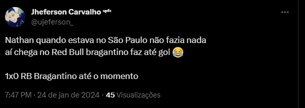 “Nathan quando estava no São Paulo não fazia nada aí chega no Red Bull Bragantino faz até gol“, e “Mano o Nathan fez gol kkkkkkkkk o cara penou pra fazer um no São Paulo, agora com 2 jogos só já fez“
