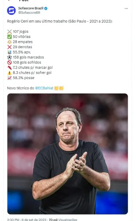 Livre no mercado até esta última quinta-feira (7), com confirmação para assumir o Bahia, Rogério Ceni teve seu último trabalho realizado pelo São Paulo. O ídolo e ex-técnico do Tricolor Paulista esteve no comando entre 2021 à 2023 e atingiu alguns números interessantes pelo clube paulista.