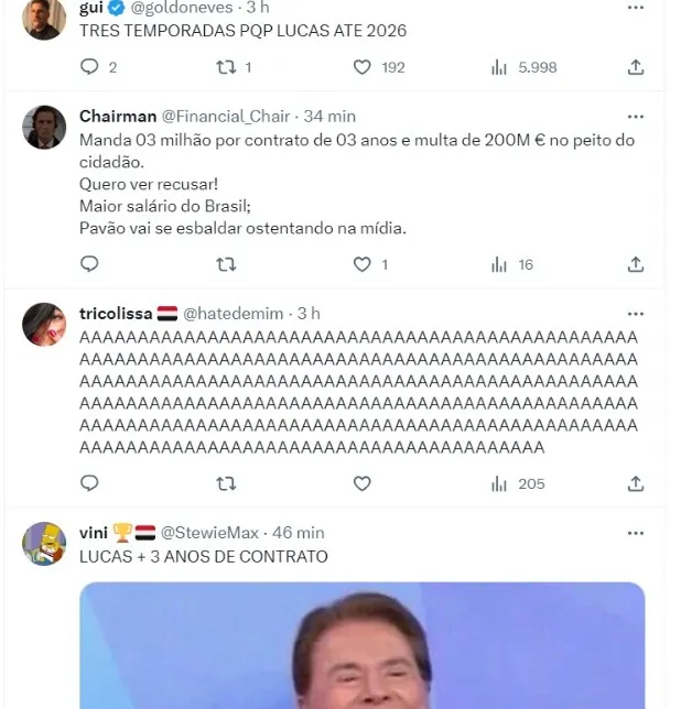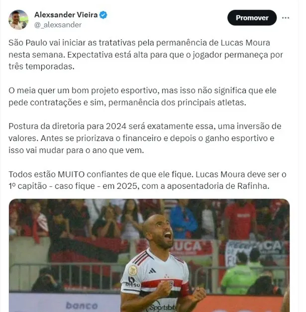 Todos do São Paulo estão muitos confiantes de que ele fique. Lucas Moura deve ser o 1º capitão – caso fique – em 2025, com a aposentadoria de Rafinha. O lateral-direito também deve assinar a sua renovação nos próximos dias e ficar para a disputa da próxima Libertadores da América.