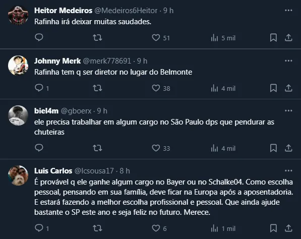 Eles são da mesma posição, tô parando de jogar e estamos todos os dias juntos. Eu cobro posicionamento, cobro pra enxergar o jogo diferente. O Moreira, Igor Vinícius e o que está chegando agora, Igor o nome, o São Paulo está bem servido de laterais, na direita e na esquerda com Welington e Patryck”, finalizou.