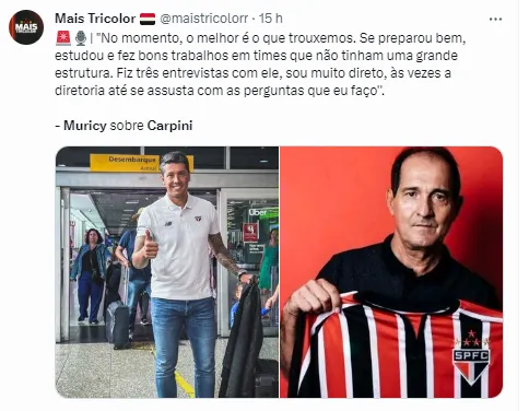 Com esse cenário, em sua participação no programa do jornalista Benjamin Back, na CNN, Muricy Ramalho mandou a real sobre o jovem treinador. Ele deixou claro que Carpini está preparado e tem confiança nele.