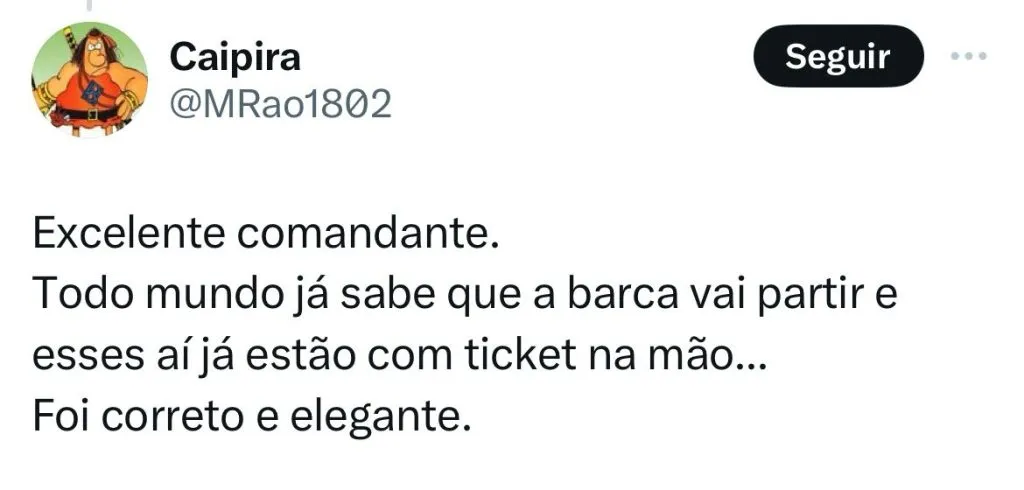 “Nem todos serão aproveitados, é natural. Sinto por isso, mas não foi culpa nossa. Por um número alto de lesões, a diretoria optou por grupo maior”, concluiu o técnico, que encerrou sua coletiva minutos depois no Morumbi.