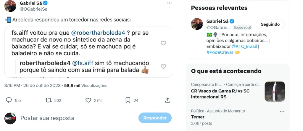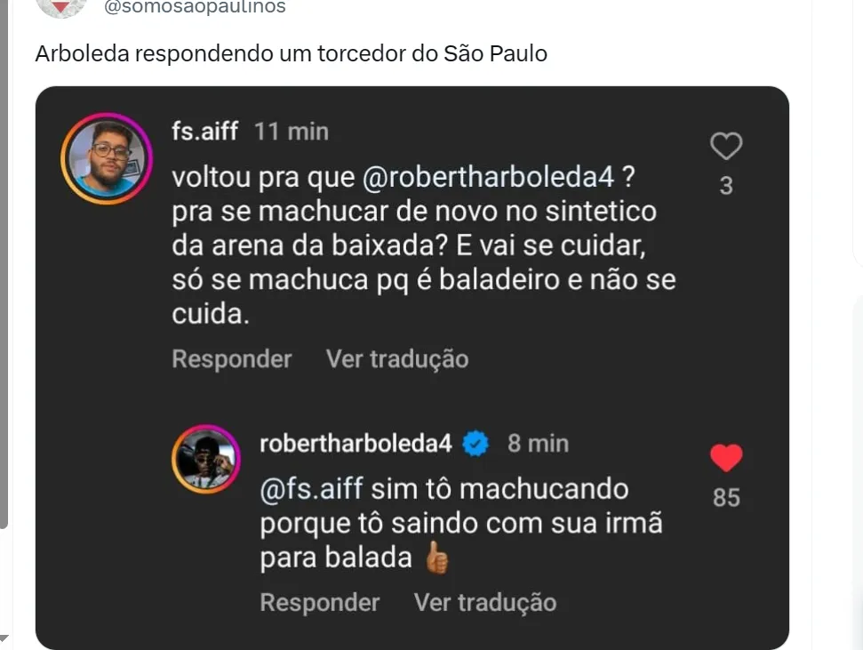 Arboleda fez questão de responder a crítica de um torcedor na internet, há pouco, e passou um pouco do limite na rebatida. “Voltou para quê, Arboleda? Para se machucar de novo no sintético da Arena da Baixada? E vai se cuidar, só se machuca porque é baladeiro e não se cuida”, escreveu o torcedor.
