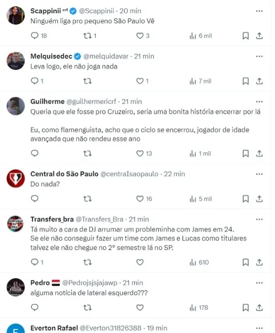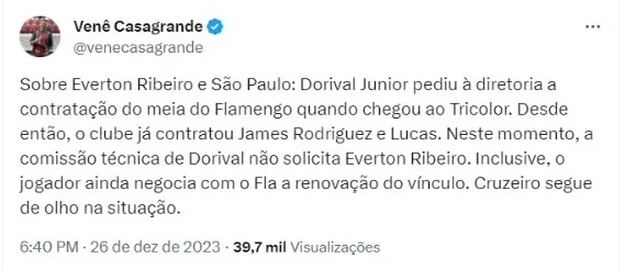 Sobre Everton Ribeiro e São Paulo: Dorival Junior pediu à diretoria a contratação do meia do Flamengo quando chegou ao Tricolor. Desde então, o clube já contratou James Rodriguez e Lucas“, escreveu Venê Casagrande no Twitterveja a postagem abaixo.