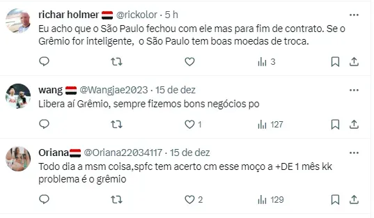 No entanto, o grande foco para o começo da temporada é outro jogador do Grêmio: Ferreira. O São Paulo está fazendo de tudo para contratar o camisa 10 do Clube Gaúcho. O jogador é tido como essencial para o planejamento de 2024.