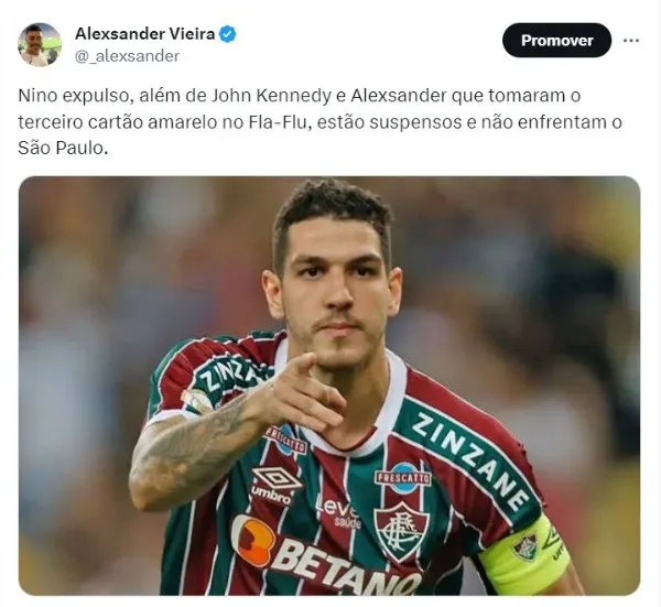 Nino expulso, além de John Kennedy e Alexsander que tomaram o terceiro cartão amarelo no Fla-Flu, estão suspensos e não enfrentam o São Paulo.