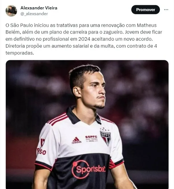 O São Paulo iniciou as tratativas para uma renovação com Matheus Belém, além de um plano de carreira para o zagueiro. Jovem deve ficar em definitivo no profissional em 2024 aceitando um novo acordo. Diretoria propõe um aumento salarial e da multa, com contrato de quatro temporadas.