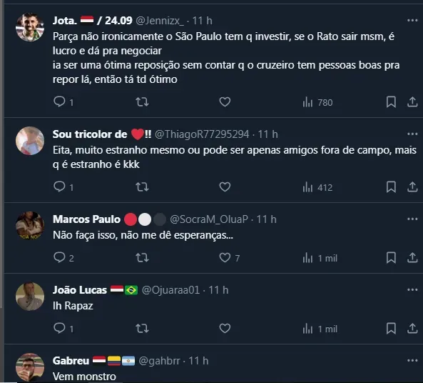 O jogador do Cruzeiro atuou com Luciano nos tempos de Fluminense, mas a atitude causou um burburinho. Afinal, o interesse do SPFC pelo jogador já foi exposto e a torcida tricolor resolveu dar uma “forcinha” nas redes sociais, voltando a pedir sua contratação.