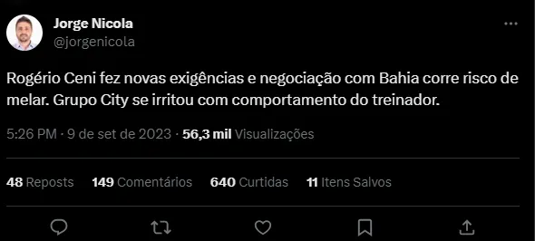 Antes, um dos maiores ídolos do São Paulo estava perto de acerto com o Bahia, mas parece que a negociação pode melar. De acordo com o jornalista Jorge Nicola, Ceni fez novas exigências à diretoria do Tricolor de Aço, o que irritou o Grupo City, que faz a gestão do clube baiano.
