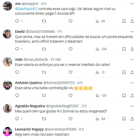E completou: “O Rui adora o Mastriani e entende que ele pode ser uma ótima alternativa para a reserva do Calleri já que o Erison não deve ficar para o ano que vem e o São Paulo vai buscar um substituto”.