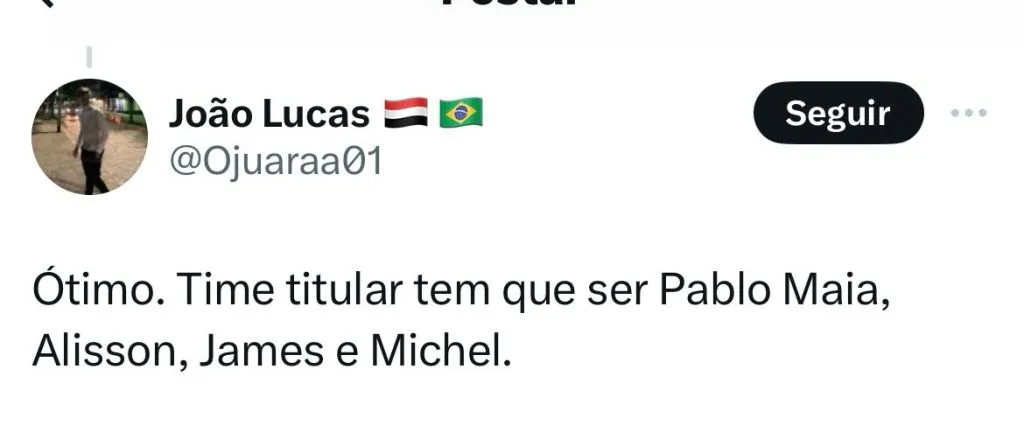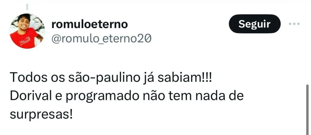 “Dorival já elegeu um substituto para Rodrigo Nestor: Será o Uruguaio Michel Araujo, já titular no próximo jogo. Time não pretende ir ao mercado pra repor na posição do Nestor que só volta entre março e abril”, disse o jornalista.