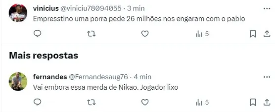 “ATENÇÃO: Athletico faz proposta para o atacante Nikão voltar ao clube. Jogador tem contrato com o São Paulo até o final de 2024, e o CAP negocia a vinda do atleta por empréstimo“, escreveu a jornalista no X – veja o Twitter completo abaixo.