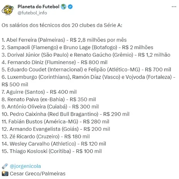 Abel Ferreira é dono do maior salário do futebol brasileiro, com salários na casa dos R$ 2,8 milhões por mês. Jorge Sampaoli e Bruno Lage completam o pódio ganhando 2 milhões mensais. O jornalista divulgou um ranking em sua redes sociais com todos os vencimentos do Brasil.