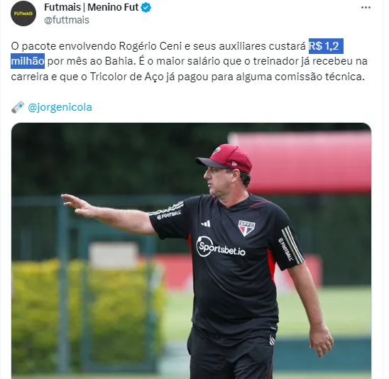Rogério acabou aceitando dirigir o Bahia no decorrer da temporada após a saída do português Renato Paiva do comando técnico da equipe de Salvador. No entanto, acabou vindo à tona algumas informações a respeito de quanto o Grupo City terá que desembolsar para sustentar o trabalho do treinador e isso acabou surpreendendo a muitos.
