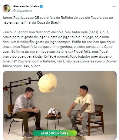 O título do São Paulo da Copa do Brasil foi o grande momento da história recente do Clube. Uma situação que chamou atenção foi sobre uma confirmação de Rafinha de que o meia colombiano James Rodríguez teria ficado incomodado por não ter jogado a final do torneio. James concedeu entrevista ao GE e falou sobre o assunto.