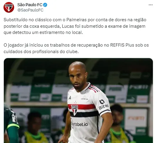 O São Paulo informou que o jogador teve um estiramento na região posterior da coxa esquerda. Lucas fez exame de imagem nesta quinta-feira (26), que detectaram a lesão. Ele será desfalque nos próximos jogos do Tricolor na temporada no Campeonato Brasileiro.