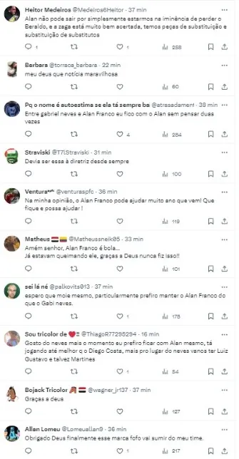 (SIC) “Bem, a coisa é dinâmica… Proposta do Boca por Alan Franco pode moiar. Time não consegui a vaga na Libertadores 2024 e tá com ordem de cortar gastos. O que isso significa? Que Gabriel Neves está praticamente descartado para ano que vem“, publicou.