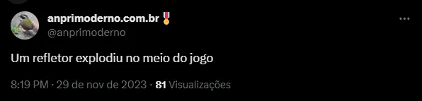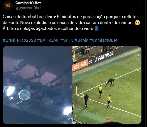 “Um refletor explodiu no meio do jogo”, “Simplesmente explodiu um monte de refletor na Arena Fonte Nova. Tudo escuro e cheio de caco de vidro no gramado” e “Um refletor EXPLODIU e caiu vidro no gramado…”, foram alguns comentários.