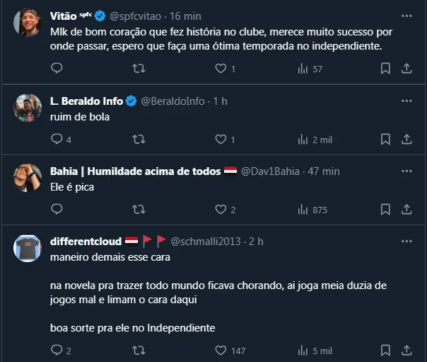 Se alguns resolveram utilizar a postagem do jogador para criticá-lo, boa parte demonstrou apoio ao meio-campista e reclamou da forma como a direção resolveu negociá-lo, mesmo depois de anos no Clube.