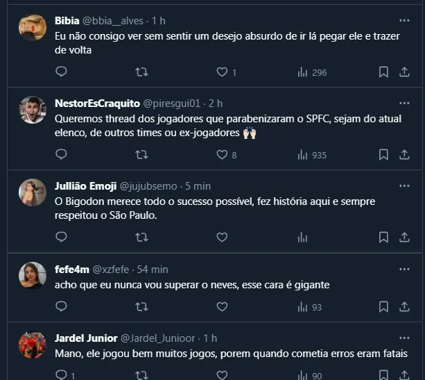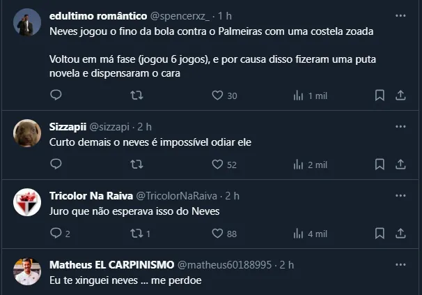Em suas redes sociais, Neves postou a seguinte mensagem: “Parabéns meu time, gigante. Torcendo por vocês sempre”. Não à toa, o assunto virou tema de debate entre os torcedores são-paulinos.