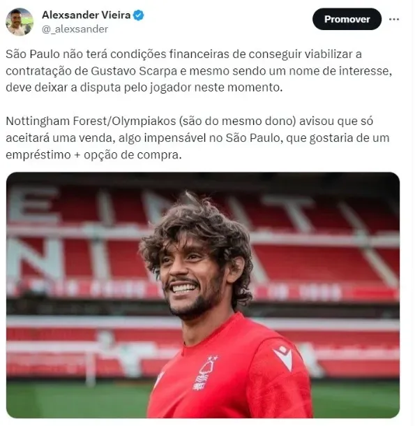 Nottingham Forest/Olympiakos (são do mesmo dono) avisou que só aceitará uma venda, algo impensável no São Paulo, que gostaria de um empréstimo com opção de compra.