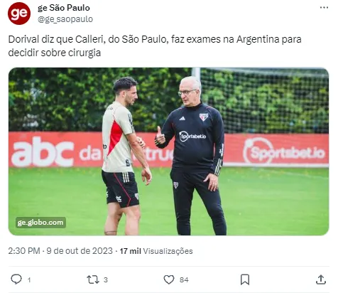Segundo Dorival, o São Paulo gostaria de contar com o Calleri até o final do Brasileirão deste ano, até para garantir a equipe na Série A de 2024. Mas por opção do próprio jogador, o atacante viajou rumo à Argentina na intenção de realizar exames com médicos da confiança do artilheiro. No meio disso tudo, o atleta aguarda a resposta se precisará por cirurgia agora ou então no final de 2023. Dorival deixou claro que queria ter ele em campo.